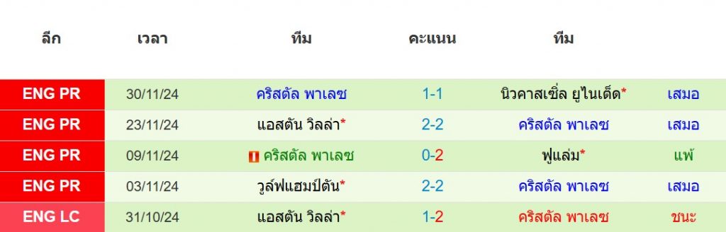 สถิติ 5 นัดหลังสุดของ : คริสตัล พาเลซ