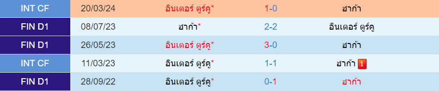 สถิติพบกัน 5 นัดหลังสุดของ : อินเตอร์ ตูร์คู -vs- ฮาก้า