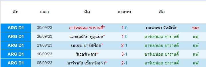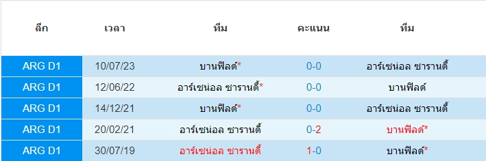 สถิติพบกัน 5 นัดหลังสุดของ : อาร์เซน่อล ซารานดี้ -vs- บานฟิลด์