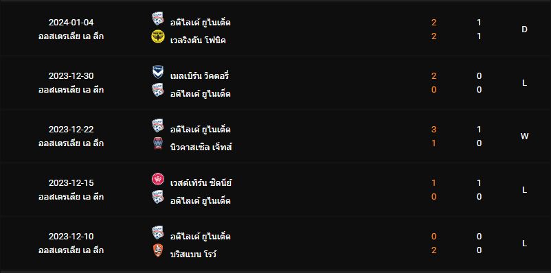 สถิติ 5 นัดหลังสุดของ : อดิไลเด้ ยูไนเต็ด