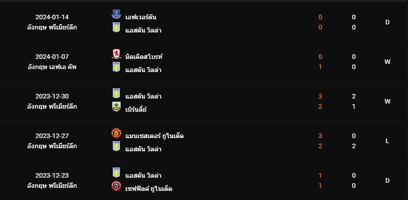 สถิติ 5 นัดหลังสุดของ : แอสตัน วิลล่า