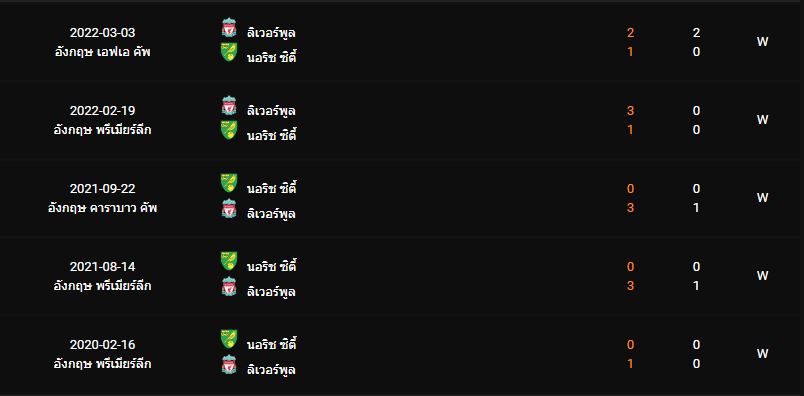 สถิติพบกัน 5 นัดหลังสุดของ : ลิเวอร์พูล -vs- นอริช ซิตี้