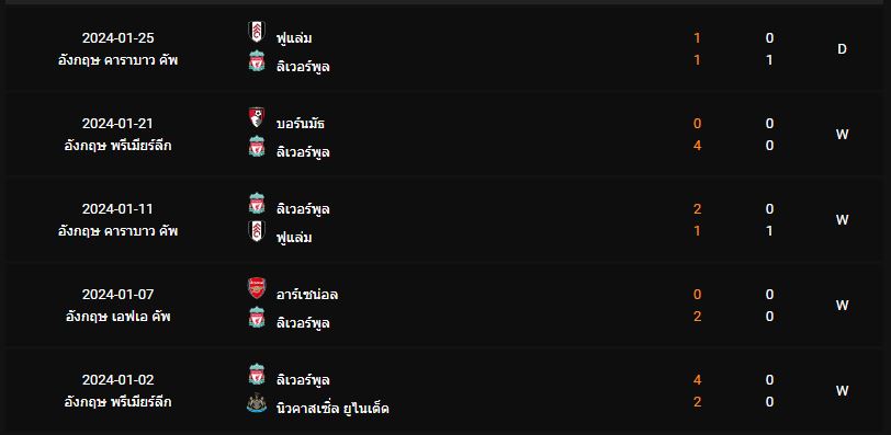 สถิติ 5 นัดหลังสุดของ : ลิเวอร์พูล