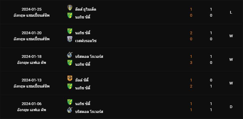 สถิติ 5 นัดหลังสุดของ : นอริช ซิตี้