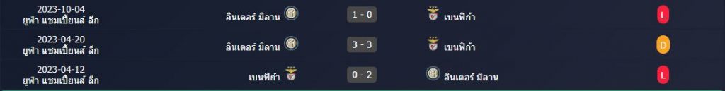 สถิติพบกัน 3 นัดหลังสุดของ : เบนฟิก้า -vs- อินเตอร์ มิลาน