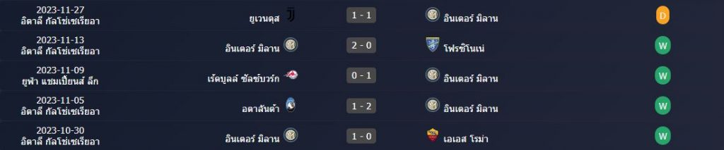 สถิติ 5 นัดหลังสุดของ : อินเตอร์ มิลาน