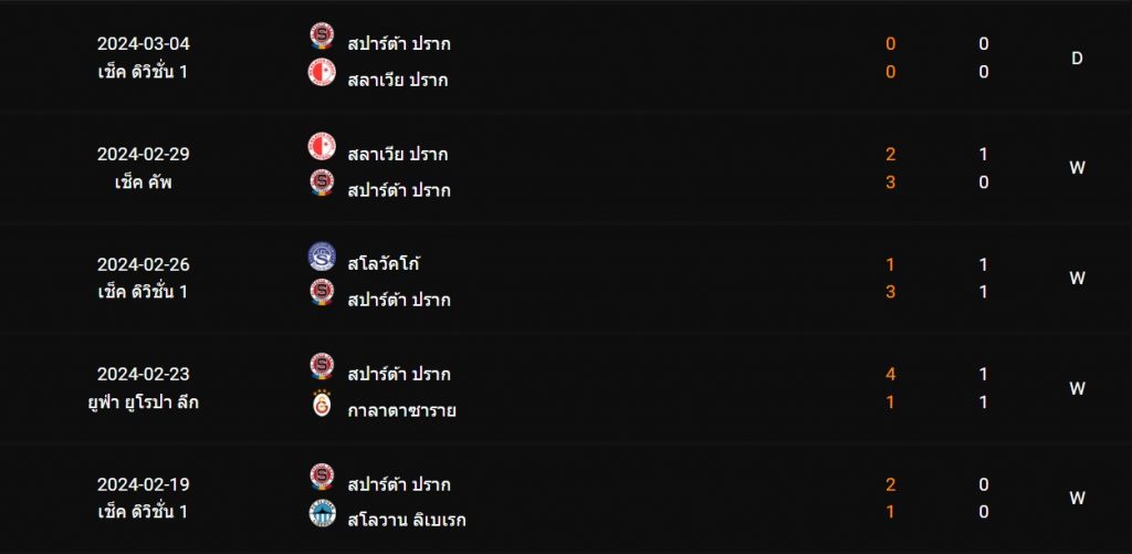 สถิติ 5 นัดหลังสุดของ : สปาร์ต้า ปราก