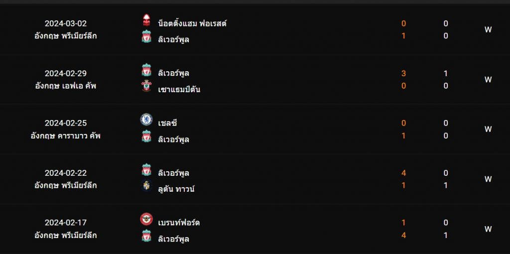 สถิติ 5 นัดหลังสุดของ : ลิเวอร์พูล