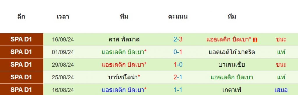 สถิติ 5 นัดหลังสุดของ : แอธฯบิลเบา