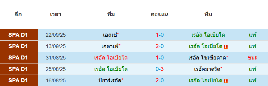สถิติ 5 นัดหลังสุดของ : เรอัล โอเบียโด้
