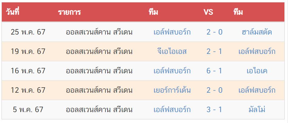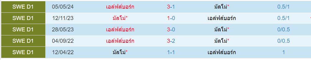 สถิติพบกัน 5 นัดหลังสุดของ : มัลโม่ -vs- เอล์ฟสบอร์ก