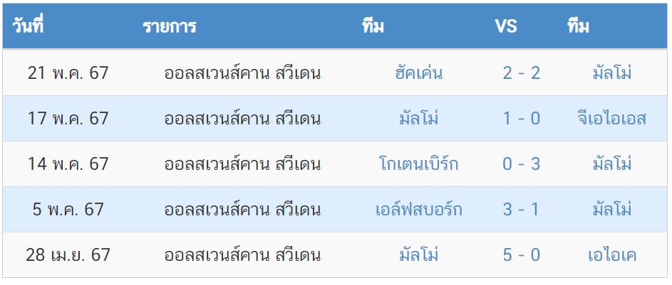 สถิติ 5 นัดหลังสุดของ : มัลโม่