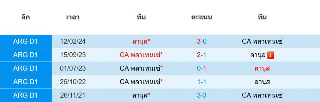 สถิติ 5 นัดหลังสุดของ : ลานุส -vs- ซีเอ พลาเทนเซ่