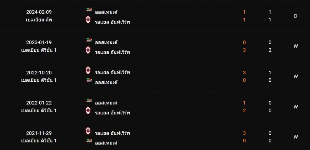 สถิติพบกัน 1 นัดหลังสุดของ : รอแยล อันท์เวิร์พ -vs- ออสเทนเด้