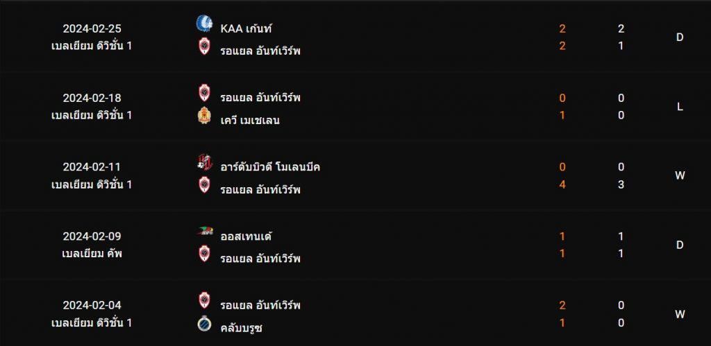สถิติ 5 นัดหลังสุดของ : รอแยล อันท์เวิร์พ
