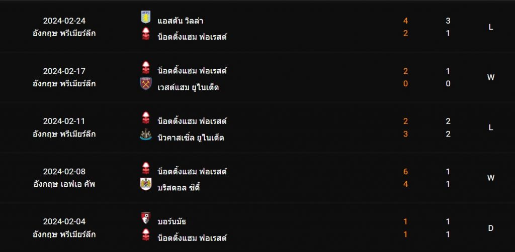 สถิติ 5 นัดหลังสุดของ : น็อตติ้งแฮม ฟอเรสต์