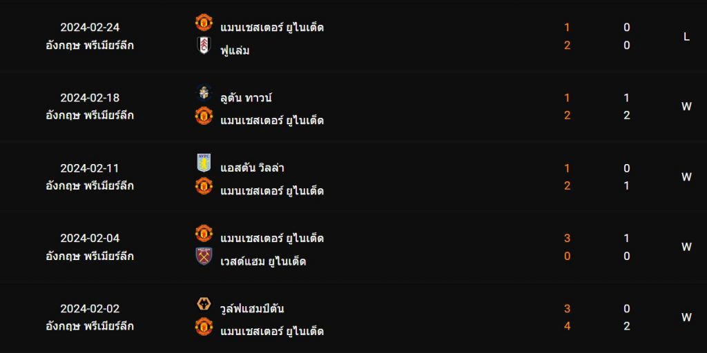 สถิติ 5 นัดหลังสุดของ : แมนฯ ยูไนเต็ด