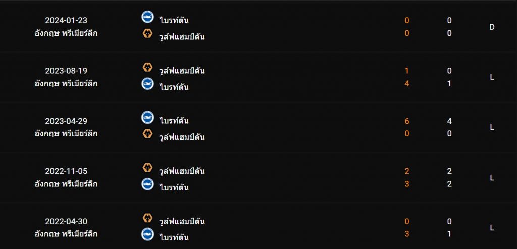 สถิติพบกัน 1 นัดหลังสุดของ : วูล์ฟแฮมป์ตัน -vs- ไบรท์ตัน