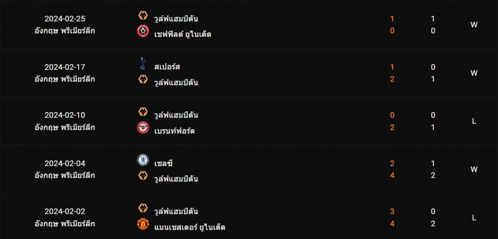 สถิติ 5 นัดหลังสุดของ : วูล์ฟแฮมป์ตัน