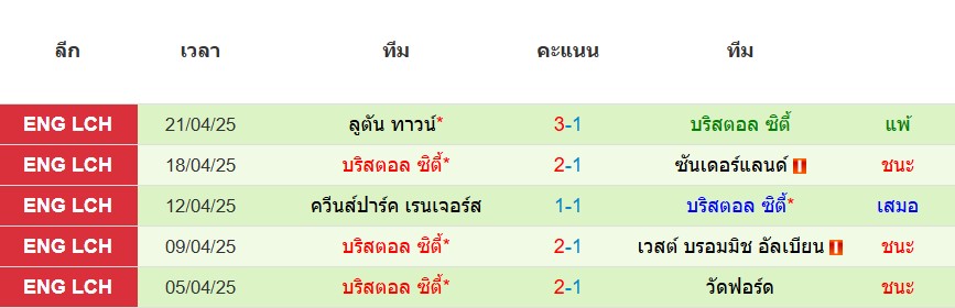 สถิติ 5 นัดหลังสุดของ : บริสตอล ซิตี้