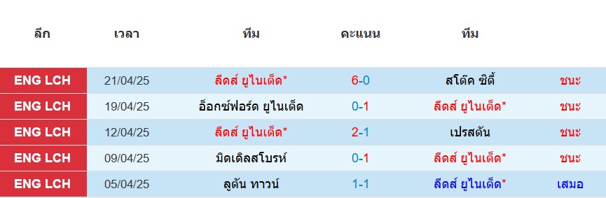 สถิติ 5 นัดหลังสุดของ : ลีดส์