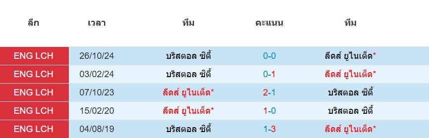 สถิติ 5 นัดหลังสุดของ : ลีดส์ -vs- บริสตอล ซิตี้