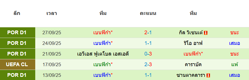 สถิติ 5 นัดหลังสุดของ : เบนฟิก้า
