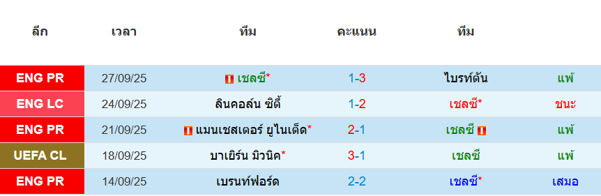 สถิติ 5 นัดหลังสุดของ : เชลซี