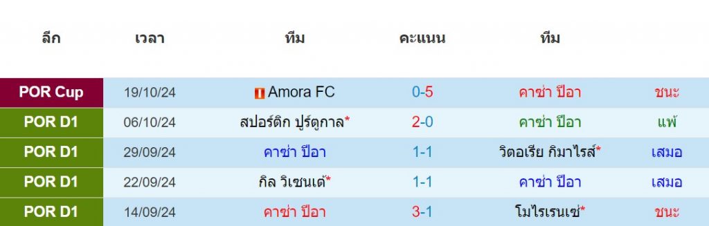 สถิติ 5 นัดหลังสุดของ : คาซ่า เพีย