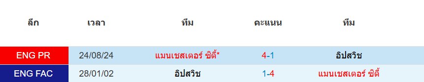 สถิติ 2 นัดหลังสุดของ : อิปสวิช ทาวน์ vs แมนฯ ซิตี้