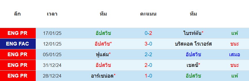 สถิติ 5 นัดหลังสุดของ : อิปสวิช ทาวน์
